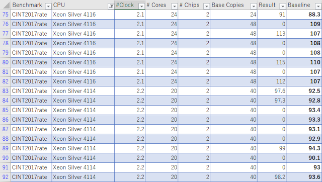 ダウンロードした CSV を開くと以下の様なフォーマットとなり、私はこれを整形して、CPU のモデル、動作クロック数、コア数、ソケット数 と Baseline スコアを整理して比較の元としています。